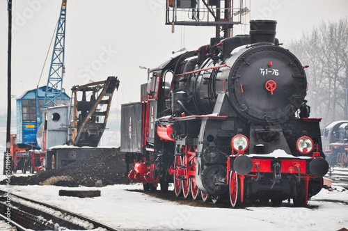 © Aldona, Naklejka premium Old vintage steam train, locomotive, train with red wheels, old carriages beautiful wehicle