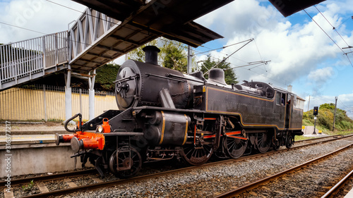 © Dawid, Naklejka premium Old vintage steam train or locomotive arrived at station or platform, Greystones, Ireland
