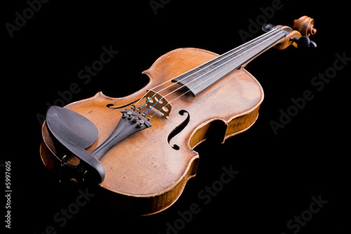 © Oleg Kozlov, Fototapeta premium old violin close-up isolated on black background