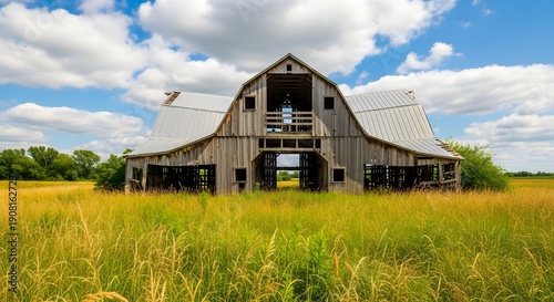 Obraz premium Old Weathered Barn Standing in Tall Golden Grass Under Blue Sky weathered wood