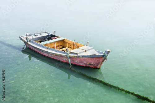 Naklejka premium Old weathered wooden boat moored in greenish water.
