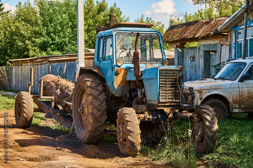© timltv, Obraz premium Old wheeled tractor with trailer