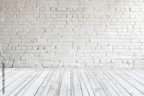 Fototapeta premium Old white brick wall and wooden floor with copy space for your text