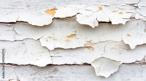 Obraz premium Old white paint is flaking off a wooden surface, revealing the weathered texture underneath