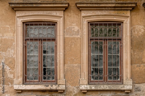 © The 2R Artificiality, Fototapeta premium Old Windows Secured with Decorative Grilles on a Stone Facade