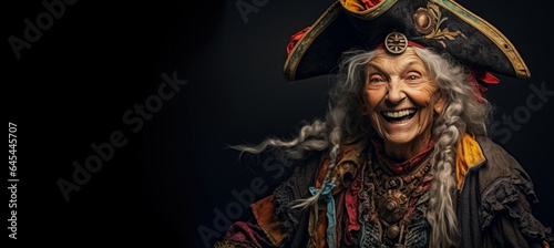 © fotogurme, Naklejka premium Old woman in the whimsical costume of a pirate isolated on a vivid background with a place for text
