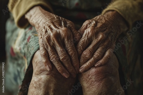 © Maelgoa, Fototapeta premium Old woman’s sore knee with wrinkled hands, close-up, warm color tone, aged skin texture, focus on joint 1