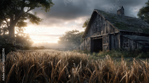 Fototapeta premium Old wooden barn at sunrise with wheat field, rural countryside landscape, dramatic sky, misty morning, weathered timber, golden crops, serene agricultural scene