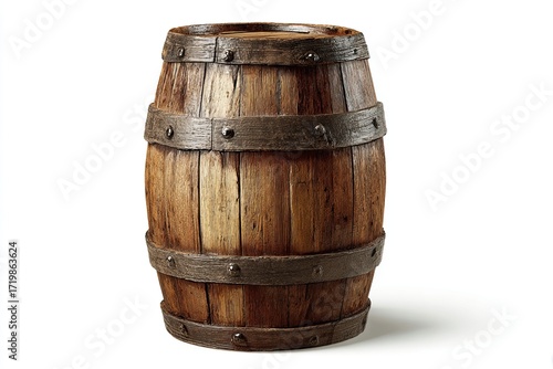 © Talita, Obraz premium Old Wooden Barrel with Metal Bands on White Background for Rustic Decor