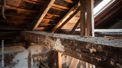 © akun, Obraz premium Old wooden beams supporting the roof structure in an attic space needing restoration