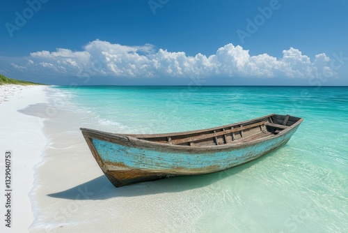 © SY, Naklejka premium Old wooden boat on a pristine beach, turquoise water. Perfect for travel, vacation, or relaxation themes, evokes tranquility.