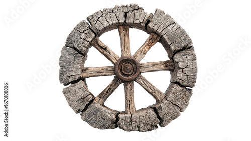 Obraz premium Old wooden cart wheel on a white isolated background.
