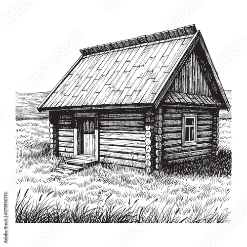 Obraz premium Old Wooden Cottage Drawing – Rural Landscape Line Art