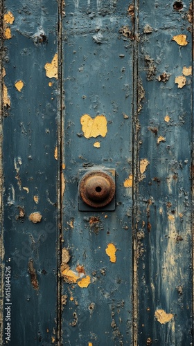 © Cingcang Gulai, Fototapeta premium Old Wooden Door Detail with Weathered Paint and Rustic Bell