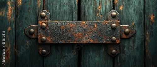 © Qbertstudio, Fototapeta premium Old wooden door features rusty iron hinge, suggesting history, age, deterioration.