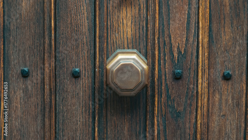 © Наталья Добровольска, Fototapeta premium Old wooden door handle closeup showing rustic charm and antique craftsmanship