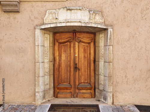 © maksim_e, Naklejka premium Old wooden door in the center of the old town in Riga, Latvia