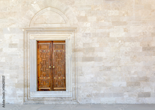 © Sergey T.., Obraz premium Old Wooden Door on Grunge sandstone Wall. Temple.