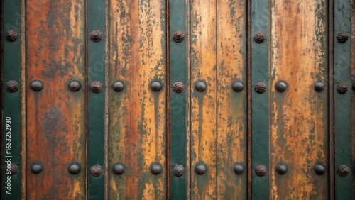 © PixelVerseStudio, Fototapeta premium Old wooden door with green paint and rusty metal studs and nails