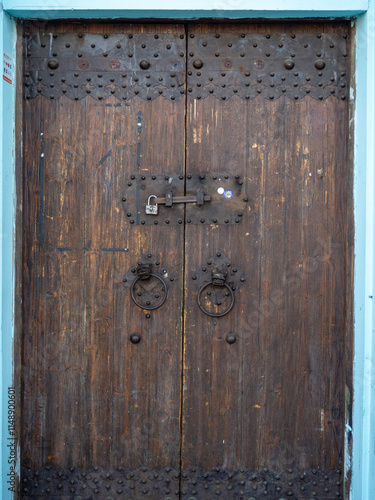 © Aleksandr, Fototapeta premium Old wooden door with locks and rings. Closed door.