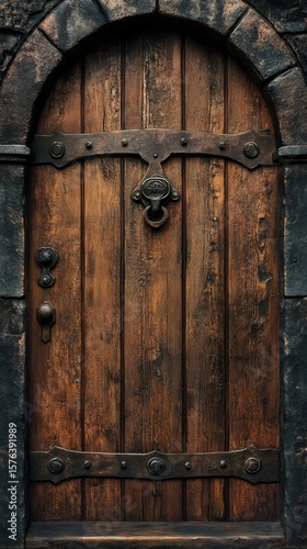 Fototapeta premium Old Wooden Door with Stone Frame and Decorative Hardware