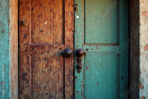 © Kachaphot, Fototapeta premium Old wooden door with wooden hinges and a wooden keyhole, wooden hinges, wooden decor