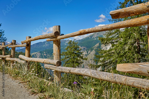 © Evgenia, Fototapeta premium Old wooden fence. Against the background of blue sky, white clouds and high beautiful mountains. Green wild fields.