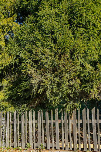 © chrupka, Fototapeta premium old wooden fence and fir tree