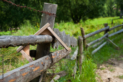Fototapeta premium Old wooden fence in the mountains. Forest and tall trees. Mountains and hills. Summer