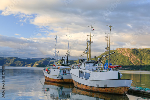 © Gunnar E Nilsen, Fototapeta premium Old wooden fishing boats at the quay in Rognan, Salten