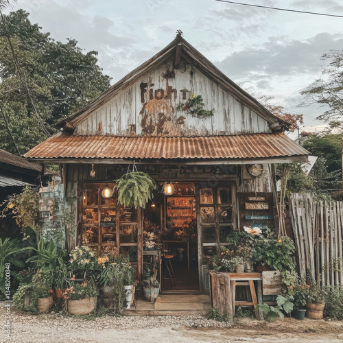 © อัสนัย แก้วบุญเรือง, Naklejka premium Old wooden house in the forest surrounded by trees and flowers