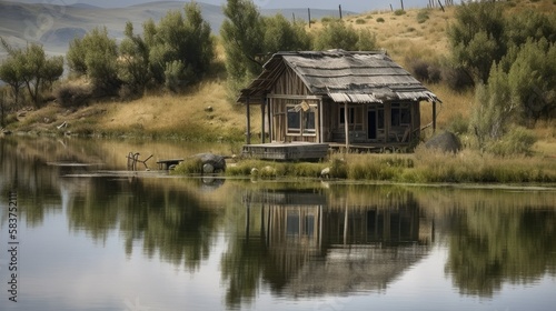 © Tuyres, Obraz premium Old wooden house on a lake. Generative AI illustration.