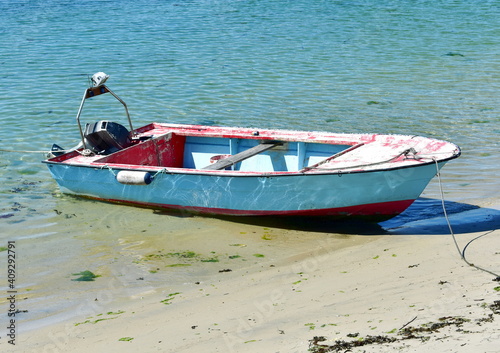 © JB, Naklejka premium Old wooden motor boat moored on a beach. Rias Baixas Region, Galicia, Spain.