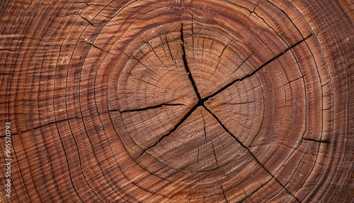 Naklejka premium Old wooden oak tree cut surface. Detailed warm dark brown and orange tones of a felled tree trunk or stump. Rough organic texture of tree rings with close up of end grain.