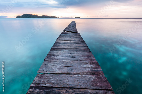 © Katya Tsvetkova , Obraz premium Old wooden pier in Indian ocean. Tropic island. Tranquil sunset landscape