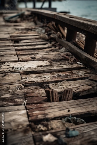 © Rudsaphon, Obraz premium Old wooden pier on the beach at sunset. Selective focus. Toned.Generative Ai