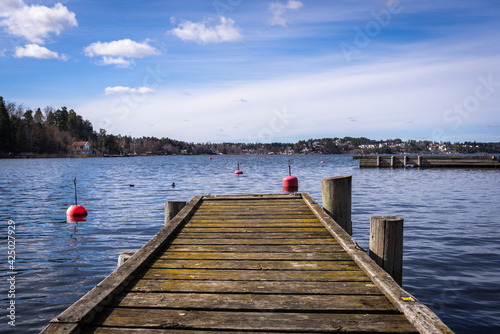 © GenоМ., Obraz premium Old wooden pier or jetty for yachts and boats. Spring landscape of the coast of Sweden. Forest islands with evergreen trees in the gulf of the Baltic Sea. Panoramic view of Scandinavia in early spring