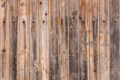 © Delphotostock, Naklejka premium Old wooden planks texture with rusty nails, vintage background