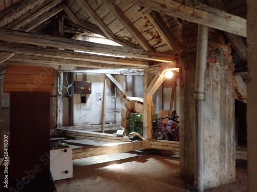 © luciezr, Fototapeta premium old wooden roof beam structure