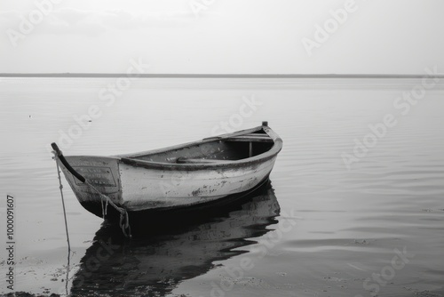© Tasnim, Naklejka premium Old wooden rowboat floating on still water in a black and white landscape.