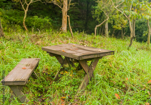 © aminkorea, Naklejka premium Old wooden table and bench set amidst dense greenery and trees in a secluded forest area.