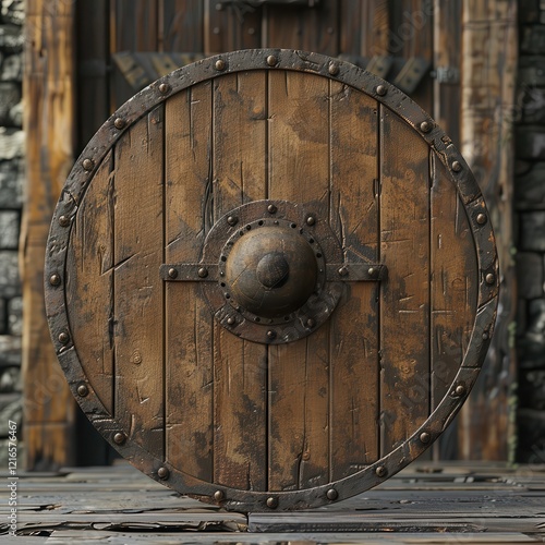 Fototapeta premium Old Wooden Viking Shield as a Protective Sign for Historical Displays