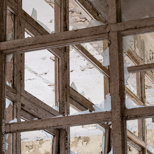 © Simon, Fototapeta premium old wooden window frames in an abandoned stores building