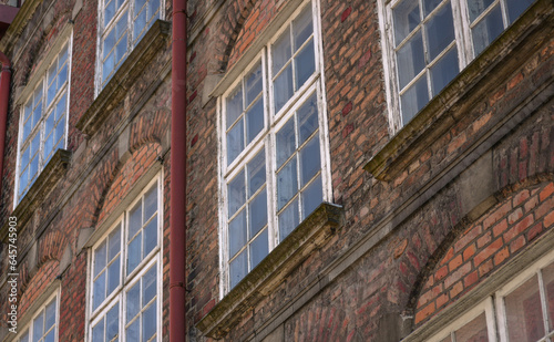 Fototapeta premium Old wooden windows on the facade of an old brick building with a water pipe