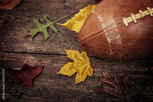 Obraz premium Old worn football with autumn leaves