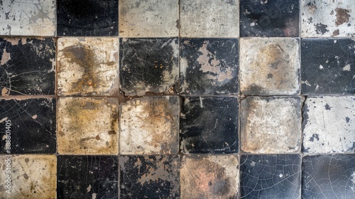 © pngking, Fototapeta premium Old worn square floor tiles with checkered pattern from above