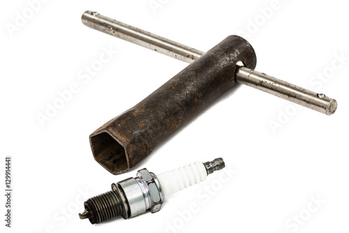 Fototapeta premium Old wrench key and spark plug, isolated on white, with clipping