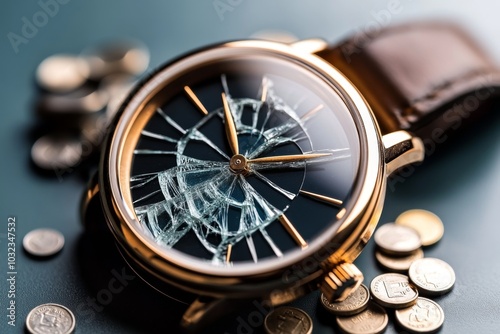 © Thanyarat, Fototapeta premium Old wristwatch with a cracked glass face, lying beside loose change