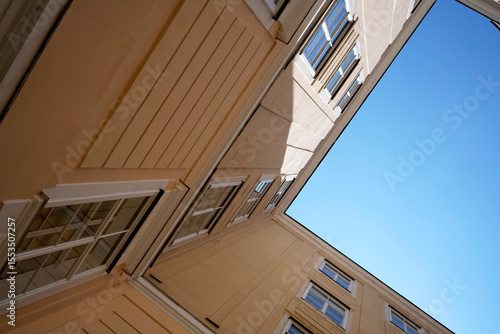 © VladyslavShcherbakov, Obraz premium Old yellow building. Clear blue sky. Windows detail. Urban architecture.