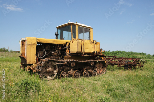 © Aptyp_koK, Obraz premium old yellow tractor, of green grass (DT-75), USSR, 1963 year